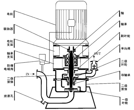 WFB型無密封自控自吸泵主要由泵體、葉輪、泵蓋、導葉、副葉輪、泵軸、連接架、電動空氣控制閥等部分組成。該泵體內部由吸入室、儲液室、氣液分離室等部分組成。泵在正常起動后,葉輪將吸入室所存的液體及吸入管路中的空氣一起吸入,液體混合氣體在葉輪高速旋轉的離心力作用下經導葉拋入氣液分離室,由于流速突然降低,氣體與液體的比重不同,較輕的氣體從混合液中分離出來并被排出泵外,脫氣的液體重新進入工作腔與葉輪內部從吸入管路中吸入的空氣再次混合,在葉輪的旋轉的作用下,很快使泵體入口形成一定的真空度,從而達到自吸的目的。由于該泵具有獨特的排氣功能,因此該泵能輸送含有氣體的液體并無須安裝底閥。該泵配有“電動空氣控制閥”運行時,控制閥關閉,實現密封;停機后控制閥打開,破壞了吸入管路中的真空,防止停機后泵腔內的液體因缸吸作用而眾吸入管路流出,使泵腔內保存足夠的液體來繼續完成自吸過程,從而實現了“首次引流、自吸”。