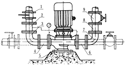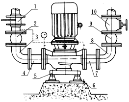 1.進口閥門 2.柔性接頭 3.彎管 4.直管 5.聯接板 6.隔振器 7.直管 8.彎管 9.柔性接頭 10.出口閥門 |