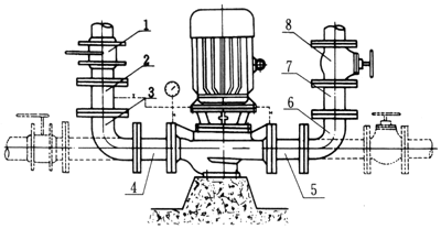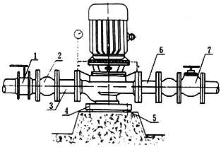 1.進口閥門 2.柔性接頭3.直管4.聯接板 5.隔振墊 6.直管 7.出口閥門 |