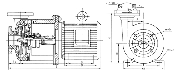 PF(FS)型系列化工泵為直聯式結構,由泵體及托架與電機法蘭聯接,托架支承泵體,葉輪通過軸與電機直聯。該系列泵的特點:結構簡單緊湊、零件少、性能好。泵的旋轉方向, 自吸入口向電機方向看為順時針方向旋轉,泵出口垂直向上。泵的密封,選用聚四氟乙烯(F4)波紋管,外裝式耐腐蝕機械密封。