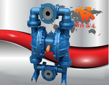 在泵的兩個(gè)對(duì)稱工作腔中,各裝有一塊有彈性的隔膜,聯(lián)桿將兩塊隔膜結(jié)成一體,壓縮空氣從泵的進(jìn)氣頭進(jìn)入配氣閥 后,推動(dòng)兩個(gè)工作腔內(nèi)的隔膜,驅(qū)使聯(lián)桿聯(lián)接的兩塊隔膜同步運(yùn)動(dòng)。與此同時(shí),另一工作腔中的氣體則從隔膜的背后排出泵外。一旦到達(dá)行程終點(diǎn)。配氣機(jī)構(gòu)則自動(dòng)地將壓縮空氣引入另一個(gè)工作腔,推動(dòng)隔膜朝相反方向運(yùn)動(dòng),這樣就形成了兩個(gè)隔膜的同步往復(fù)運(yùn)動(dòng)。每個(gè)工作腔中設(shè)置有兩個(gè)單向球閥,隔膜的往復(fù)運(yùn)動(dòng),造成工作腔內(nèi)容積的改變,迫使兩個(gè)單向球閥交替地開啟和關(guān)閉,從而將液體連續(xù)地吸入和排出。