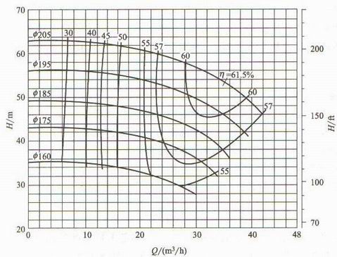 國外很多泵廠及國內引進技術生產的一些泵,往往提供全特性曲線,如圖2-4所示,該曲線包括不同葉輪直徑下的H-Q線、