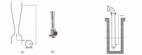 空氣提升泵(圖3-39)嚴格意義上來說并不是一種泵,因為其并沒有實現任何程度的速度和壓力的轉換。空氣或其他氣體通人提升管底端并與液體混合,因氣液混合物密度