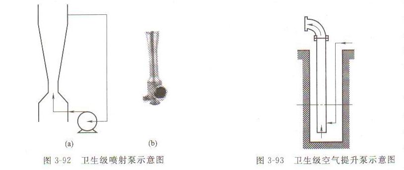 (3)噴射泵和空氣提升泵、噴射泵和空氣提升泵不如離心式和容積式泵使用頻繁。噴射泵(圖3-92)是速度能轉換為壓力能的裝置。采用噴射器或噴嘴實現。噴射泵主要用于處理污水或含有固體或化學活性物的流體。