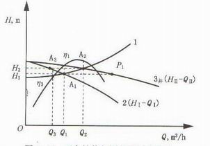 1--管路阻力曲線:2--單臺時揚程曲線:3--兩臺并聯時揚程曲線