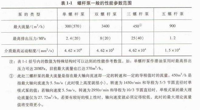 表1-1和表1-2中性能參數范圍和應用場合僅僅是泛指某類螺桿泵的一般情況,并不是包括該類螺桿泵的各種都是如此。其性能參數值也不是的。如表1-1中雙螺桿泵*高排出壓力為8(20)mpa,是指