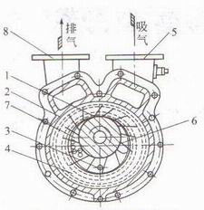 1—葉輪:2—泵體:3—注液孔:4—形成水環處:5—進氣管:6—吸氣窗口:7—排氣窗口:8—排氣管
