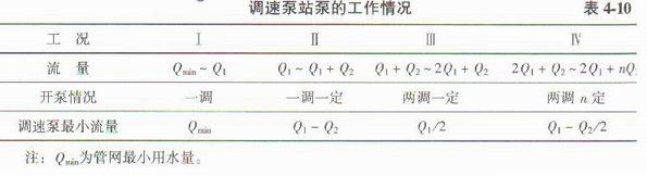 設(shè)有一送水泵站,己知*高日*大時(shí)供水量為Q,經(jīng)管網(wǎng)平差后相應(yīng)的泵站揚(yáng)程為H ,現(xiàn)考慮變速時(shí)設(shè)計(jì)工況點(diǎn)流量為Q:選用定速泵n臺(tái),其額定轉(zhuǎn)速時(shí)設(shè)計(jì)工況點(diǎn)流量為Q2。為適應(yīng)泵站工況點(diǎn)變化(流量的變化),泵的開啟情況見表4-10