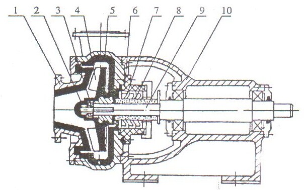 1、泵蓋2、拼帽3、防轉螺母4、葉輪、5、泵體6、密封盒7、油封8、軸套9、主軸10、軸承座