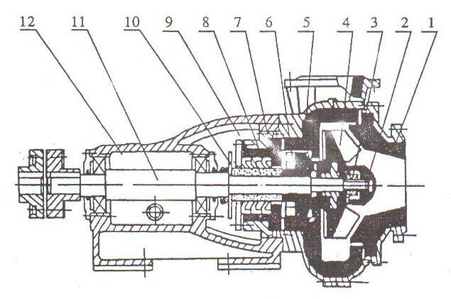 1、泵蓋2、拼帽3、防轉螺母4、葉輪、5、泵體6、副葉輪7、密封盒8、油封9、軸套10擋水圈11、主軸12、軸承座