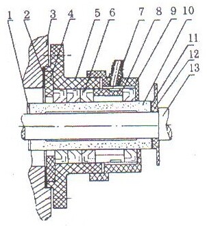 1、密封墊2、擋圈3、密封盒4、油封5、頂圈6、后壓蓋7、軸套8、擋水圈 。 1、葉輪墊2、密封盒墊圈3、泵體4、擋圈5、密封盒6、油封7、水嘴8、水封環9、密封盒壓蓋10、軸套11、軸套墊12、擋酸環13、主軸。