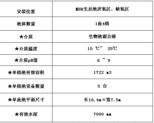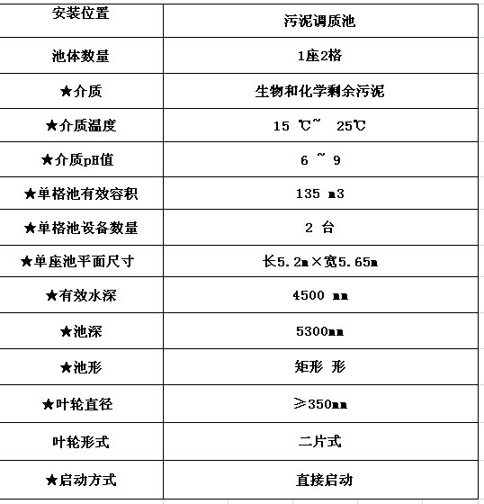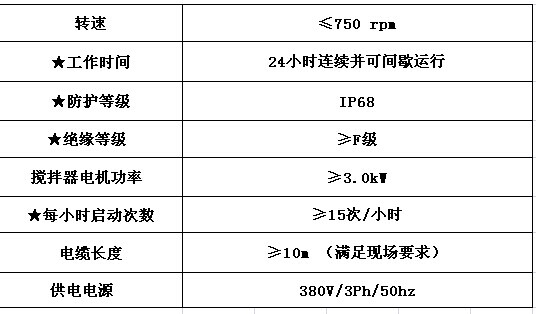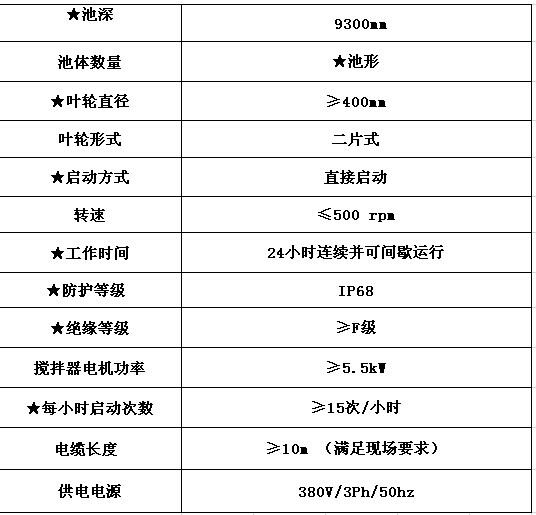1工作原理 工作原理:攪拌葉輪在電機驅動下旋轉攪拌液體產生旋向射流,利用沿著射流表面的剪切應力來進行混合,使流場以外的液體通過摩擦產生攪拌作用,在極度混合的同時,形成體積流,應用大體積流動模式得到受控流體的輸送。 2整體規格、性能要求 1)中標人應根據招標文件的規定提供滿足設計要求的成套潛水攪拌機(器)產品。 2)潛水攪拌器應適合用于工業區污水處理廠污泥濃縮池、厭氧池、生化污泥儲泥池工藝污泥水攪拌。 3)潛水攪拌器應該在全浸沒條件下連續工作。同時應能適應連續運行、間歇運行和長期停止狀態后恢復運行的工作狀況。 4)每臺潛水攪拌器應配備不銹鋼導向桿和不銹鋼提升纜,使之自由升降及轉向,保證可在無須排空的條件下就可以安裝和拆卸潛水攪拌器。潛水攪拌器全部的重量受力在一個支架上,并且這個支架必須可承受潛水攪拌器形成的推力。 5)潛水攪拌器應運行穩定,帶油室泄漏保護、定子溫升保護、配相應保護器。能滿足連續24小時運行工作。