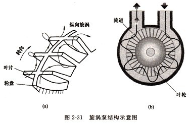 旋渦泵葉輪具有開式和閉式兩種,閉式葉輪葉片凹槽內設有中間隔板,如圖2-31(a)所示:開式葉輪無中間隔板。
