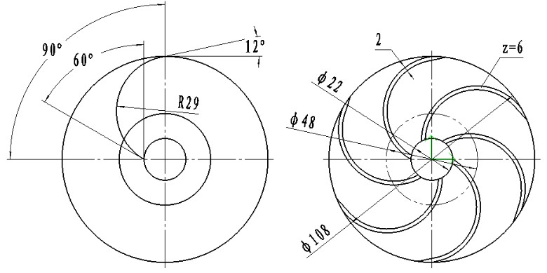 根據導葉片座標圖和裝配圖上的導流殼軸面圖,就可以畫出導流殼零件圖了。如圖2-10所示。你們可能注意到,在畫這個葉片時,沒有用方格網設計,這是我把它簡化了,簡化是有條件的,這就是流面基本是平面,這個導流殼的上下流線都在平面內,所以就可以不通過方格網而直接作圖了。既然是在平面上作圖,那就是真實的葉片安放角,為什么要說是簡化畫法呢,那是因為流線還有一小部分是在曲面上,在曲面上的葉片安放角就只有通過方格網來測量了,當然也可以在立體圖中進行測量,比如現在標注的出口安放角60度就不是真實的出口安放角,你們可以畫立體圖進行測量,估計在70度左右。QJ型井用潛水泵(深井泵)