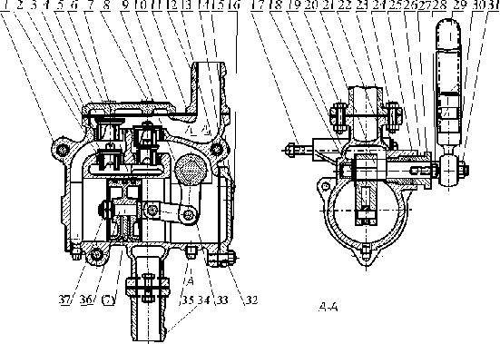 S、SH-25、38型手搖泵的結構原理是,當用手往復搖動搖手柄(29)時,通過軸(21)、搖臂(9)、連桿(36)等傳動機構,使活塞(7)作往復運動。如圖所示,當活塞向左移動時,右端的泵缸體積逐漸擴大,形成真空,液體從吸水管(34)經過鑄在泵體旁邊的吸入流道頂開吸水閥進入缸體右端。在同一時間里,缸體左側由于活塞的壓縮,使壓水閥(5)頂開,液體經吐出管(11)排出。若活塞的運動方向返回向右時,則泵缸左側吸入液體,泵缸右側排出液體,這樣往復不歇地把液體吸入排出。形成泵的工作。泵的壓水閥向上行程由蓋板(6)限止,吸水閥向上行程由壓水閥限止。蓋板與泵體用螺栓(8)緊固,活塞行程由泵蓋(14)和泵體限止。