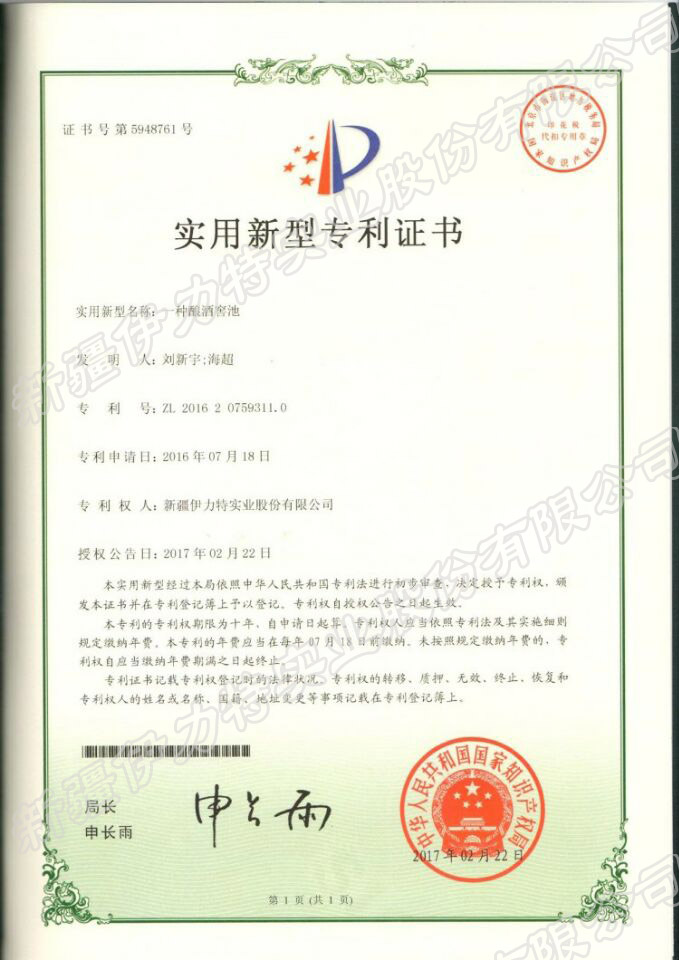 11、2018年04月“一種釀酒機(jī)械化攤涼設(shè)備專用工具”獲得國家實用新型專利證書,專利證書號:ZL 201721163684.2。