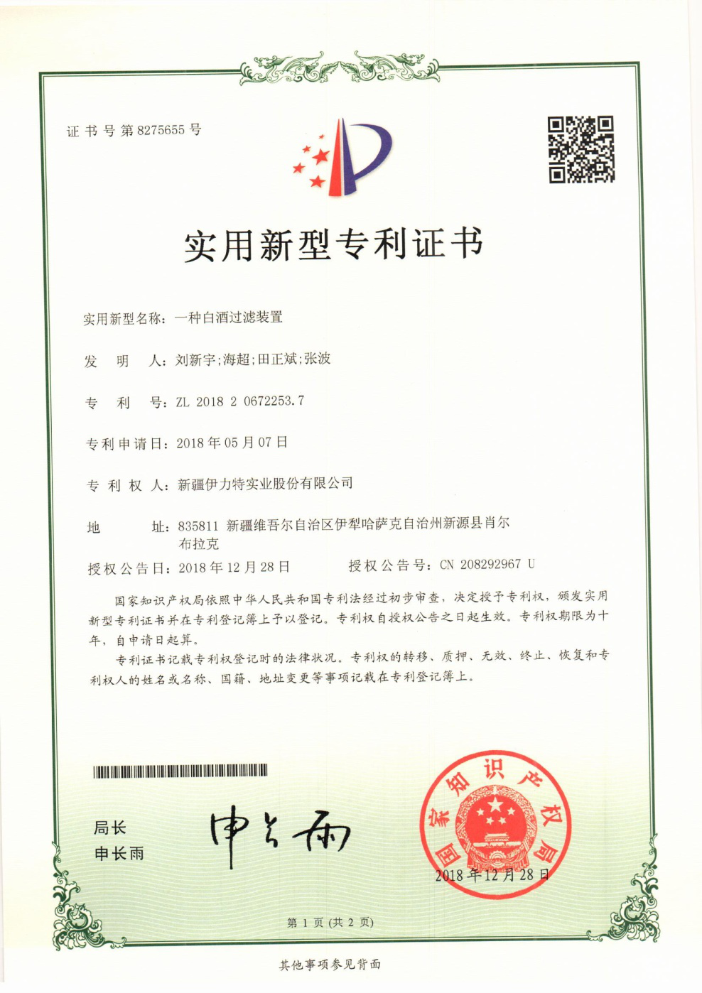 12、2018年12月“一種白酒過濾裝置”獲得國家實用新型專利證書,專利證書號:ZL 201820672253.7。